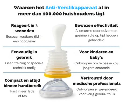 Verslikken gebeurt vaak onverwacht en kan iedereen overkomen. In zo’n moment slaat paniek toe en wordt tijd ineens cruciaal. Juist dan wil je niet hoeven nadenken, maar direct kunnen handelen. Dit anti-verslikapparaat is ontworpen voor die momenten waarop elke seconde telt.